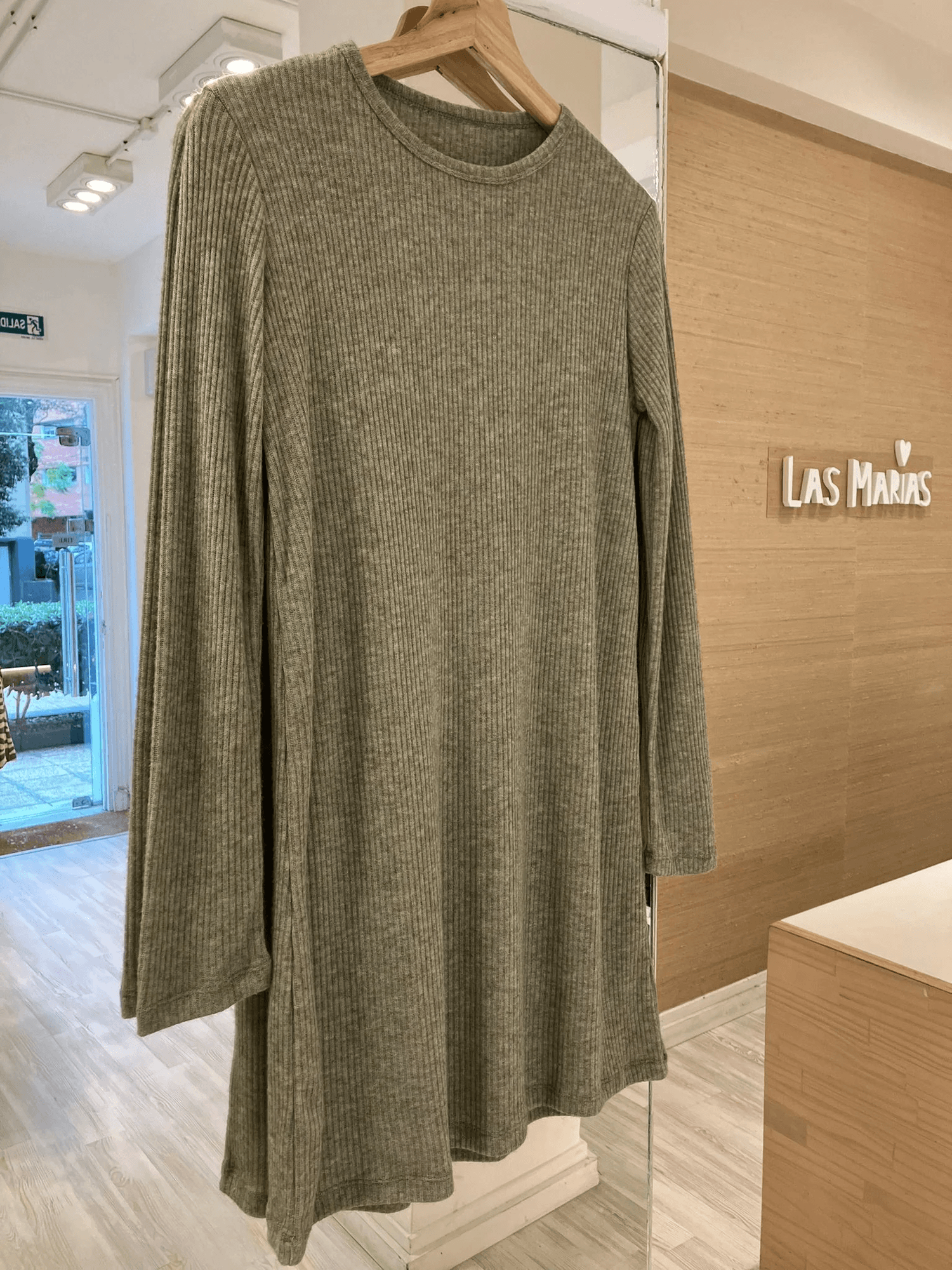 Vestido corto de lanilla rib con manga larga. Cómodo y versátil, ideal para el día a día o un look casual con estilo. Su textura suave y elasticidad brindan un calce favorecedor.